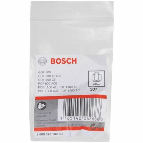 Spannzange für Bosch-Oberfräsen. Überwurfmutterset. Durchmesser: 8 mm. Schlüsselweite: 19 mm. Passend zu GOF 900. GOF 900 A. GOF 900 ACE. GOF 900 CE Professional. POF 800 ACE. POF 1100 AE. POF 1200 AE. POF 1300 ACE. POF 1400 ACE. Hinweis: Es empfiehlt sich. die passende Spannzange zum Fräserschaft-Durchmesser zu verwenden und nicht mit Schafthülsen zu arbeiten.