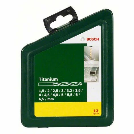 Metallbohrer-Set HSS-TiN (Titan Beschichtung). 13-teilig. Für schnelles, sauberes Bohren mit höchster Oberflächengüte. Ein aus dem Vollen geschliffener, rechtsdrehender Spiralbohrer aus Hochleistungsschnellstahl. Sicheres Anbohren ohne Vorkörnen. Schneller Bohrfortschritt mit geringster Reibung. Universell geeignet für die unterschiedlichsten Metalle, Plexiglas und Hartkunststoffe – nicht für Aluminium verwenden! Set mit leistungsstarken Metallbohrern mit hochwertiger Titan-Nitrid-Beschichtung, für besonders lange Lebensdauer und schnellen Bohrfortschritt. Bohrdurchmesser in 0,5-mm-Schritten ansteigend von 1,5 – 6,5 mm. Metallbohrer mit Titanium-Nitrid-Beschichtung. Metallbohrer mit Titanium-Nitrid-Beschichtung zeichnen sich durch eine lange Lebensdauer sowie hohe Beanspruchbarkeit aus. Zum schnellen, sauberen Bohren in unterschiedlichsten Metallen, Plexiglas und Hartkunststoffen (nicht für Aluminium verwenden). Bis zu 40 prozent schnellerer Bohrfortschritt als bei vergleichbaren Bohrern ohne Titan-Nitrid-Beschichtung. Bis zu 6-fach längere Lebensdauer bei fachgerechter Kühlung. Geringe Bruchgefahr dank hoher Elastizität. Widerstandsfähige Metallkassette für übersichtliche Aufbewahrung und Schutz der Bohrer. Für alle Elektrowerkzeugmarken geeignet. Inhalt des Sets: 13 HSS-TiN Metallbohrer mit Durchmesser: 1,5 / 2 / 2,5 / 3 / 3,2 / 3,5 / 4 / 4,5 / 4,8 / 5 / 5,5 / 6 / 6,5 mm. Geeignet für folgende Werkstoffe: Eisen, legierter Stahl bis 900 N/mm, unlegierter Stahl bis 900 N/mm, Kupfer, Bronze, Grauguss, Hartkunststoffe und Plexiglas. Hinweis: Verwendung von Kühlflüssigkeit empfohlen, z. B. Bosch Universalschneideöl 2 607 001 409. Sicherheitshinweis: Bei Gebrauch bitte Schutzbrille