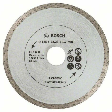 Diamanttrennscheibe für Fliesen. Durchmesser: 125 mm, Bohrungsdurchmesser: 22,23 mm, Schnittbreite: 1,7 mm, max. r.p.m: 12200 1/min. Der Spezialist für Fliesen. Gebundene Schleifmittel von Bosch sind konsequent auf leichteres, schnelleres und wirtschaftlicheres Arbeiten getrimmt. Für präzise, saubere Schnitte in Keramikfliesen ohne Kantenbruch. Allrounder für alle Fliesen und für