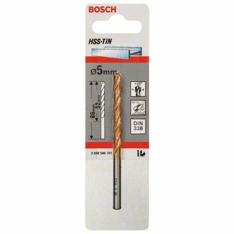 Beschreibung: Bosch Accessories 2608596701 HSS Metall-Spiralbohrer 5 mm Gesamtlänge 86 mm TiN DIN 338 Zylinderschaft 1 St.