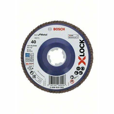 The X-LOCK Fächerschleifscheibe X571 Best for Metal bietet eine hervorragende Lebensdauer bei Metallarbeiten. Ihr Schleifflächenbesatz aus hochwertigem zirkoniumoxidverstärkten Halbedelkorundkorn ist bei extensiven Arbeiten an Metall robust und verschleißfest. Die Scheibenträgerplatte ist sowohl gewinkelt als auch gerade erhältlich und besteht aus Kunststoffmaterial. Verwenden Sie diese Scheibe zum Schruppen von Schweißnähten und Schleifen von Metalloberflächen. Dank schlüssellosem X-LOCK System lassen sich die Fächerschleifscheiben schnell und bequem wechseln. Scheibendurchmesser mm: 115, Bohrungsdurchmesser mm: 22,23, Körnung: 40, X-LOCK
