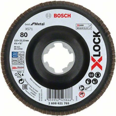 The X-LOCK Fächerschleifscheibe X571 Best for Metal bietet eine hervorragende Lebensdauer bei Metallarbeiten. Ihr Schleifflächenbesatz aus hochwertigem zirkoniumoxidverstärkten Halbedelkorundkorn ist bei extensiven Arbeiten an Metall robust und verschleißfest. Die Scheibenträgerplatte ist sowohl geschränkt als auch gerade erhältlich und besteht aus Kunststoffmaterial. Verwenden Sie diese Scheibe zum Schruppen von Schweißnähten und Schleifen von Metalloberflächen. Dank schlüssellosem X-LOCK System lassen sich die Fächerschleifscheiben schnell und bequem wechseln. Scheibendurchmesser mm: 115, Bohrungsdurchmesser mm: 22,23, Körnung: 80,
