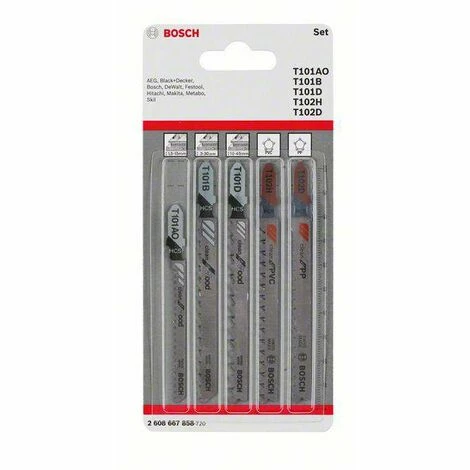 Das 5-tlg. Wood and Plastics Stichsägeblatt-Set macht saubere Schnitte in Holz und Kunststoff. Es enthält Blätter für gerade und Kurvenschnitte. Sie machen saubere Schnitte in Holz. Außerdem enthält es Blätter, die speziell für das feinsäuberliche Schneiden von Kunststoff, wie PVC und PP, geeignet sind. Sie sind kompatibel mit Stichsägen mit einem Einnockenschaftsystem. Setinhalt: T 101 AO Clean for Wood; T 101 B Clean for Wood; T 101 D Clean for Wood; T 102 H Clean for PVC; T 102 D Clean for