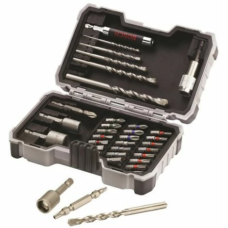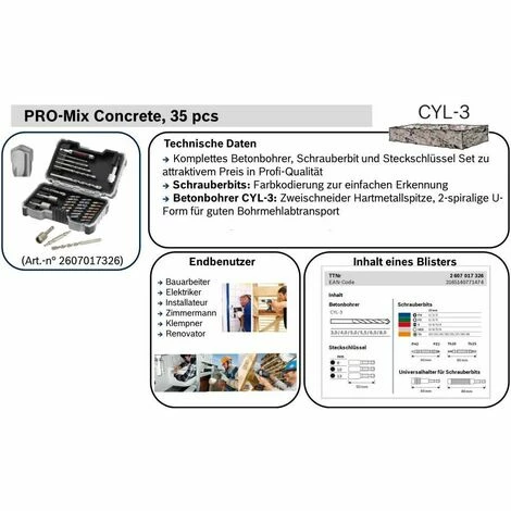 Bohrer- und Schrauber Set PRO Beton. 35-teiliges Extra Hard-Schrauberbitset. Das Extra Hart-Schrauberbit ist eine gute Wahl für allgemeine Arbeiten. Das 35-teilige Betonbohrer-/ Bit-Set von Bosch beeinhaltet ein umfassendes Sortiment an Betonbohrern und Bits für den handwerklichen Gebrauch. Das Set wird in einer praktischen Kunststoffbox geliefert. CYL-3 Betonbohrer für Bohrungen in Beton. Mauerwerk. und Kalksandstein. Das Set deckt die wichtigsten Betonbohr- und Schraubanwendungen ab. Profiqualität zu einem äußerst guten Preis-/ Leistungsverhältnis. Farbkodierung erleichtet die Bitauswahl. Das 35-teilige Set mit Extra Hart-Schrauberbits präsentiert sich in einer praktischen und robusten Staubox. die sowohl guten Überblick als auch sichere Lagerung und Transport ermöglicht. Das Set enthält: 6 Bohrer HSS-G (DIN 338): 3 / 4 /5 / 5.5 / 6 / 8 mm. 3 Steckschlüssel: 8 / 10 / 13 mm. 3 Philips Bits: PH1. PH2. PH3. Länge 25 mm. 3 Pozidrive Bits: PZ1. PZ2. PZ3. Länge 25 mm. 4 Schlitz Bits: SL3. SL4. SL5. SL6. Länge 25 mm. 4 HEX Bits: H3. H4. H5. H6. Länge 25 mm. 8 Torx Bits: T10. T15. T20. T20. T25. T27. T30. T40. Länge 25 mm. 2 Doppelseitige Bits: PH2/PZ2. T20/T25. Länge 60 mm. Das Set besteht aus Bits unterschiedlicher Länge und Art für verschiedene Schraubentypen und Steckschlüssel für Sechskantschrauben. Auch enthalten ist ein Universalmagnethalter und ein Universalhalter mit Schnellwechselfunktion.