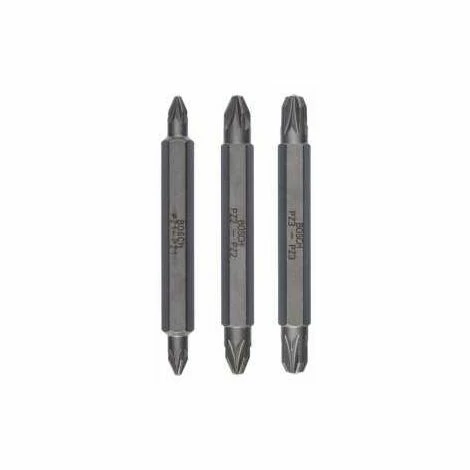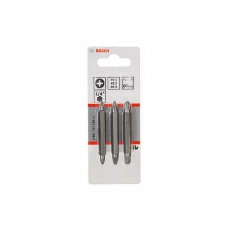 Bosch Doppelklingenbit-Set, 3-tlg., PZ1, PZ1, PZ2, PZ2, PZ3, PZ3, 60 mm | Eigenschaften: Ausführung: Doppelbit, Spezifikation: PZ1, PZ2, PZ3; PZ1, PZ2, PZ3; 60 mm, Klingenlänge: 60 mm, Anzahl der Teile: 3, Antriebsform: Sechskant, Länge mm: 60, VDE-geprüft: Nein, Abtriebsform: Kreuzschlitz Pozidrive, Kugelkopf: Nein