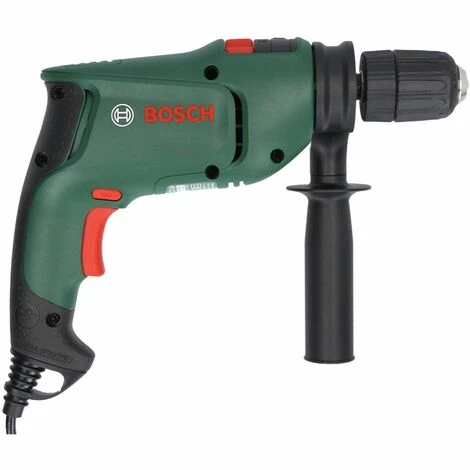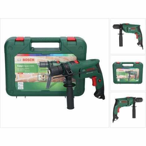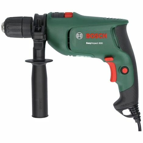 Die EasyImpact 600 Schlagbohrmaschine von Bosch ist ein praktisches Elektrowerkzeug für Heimwerker, das bei Renovierungs- und Montagearbeiten eingesetzt werden kann. Die Schlagbohrmaschine ist zum Schlagbohren in leichten Baustoffen sowie zum Bohren in Holz, Metall und Kunststoff geeignet. Die Schlagbohrmaschine ist dank des kleinen Korpus und einem Gewicht von gerade einmal 1,7 Kg leicht und handlich zu bedienen. Der Zubehörwechsel gestaltet sich dank des Schnellwechselfutters Werkzeuglos und besonders einfach. Der Seitengriff gewährleistet einen bequemen und sicheren Halt und sorgt somit für volle Kontrolle über die Maschine. Der Tiefenanschlag hilft das Bohrloch bis zu der gewünschten Tiefe zu Bohren.