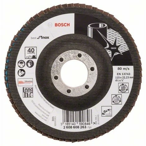 Fächerschleifscheibe X581. Best for Inox. Gewinkelte Ausführung – EN 13743 für Winkelschleifer. Scheibendurchmesser: 115 mm, Bohrungsdurchmesser: 22,23 mm, Körnung 40. Optimale Drehzahl 5.500 – 8.500 min-1. Besonders geeignet zur Bearbeitung von Edelstahl (Inox). Leistungsstark dank Hochleistungszirkonkorund. Vollkunstharzgebunden. Stabiles X-Gewebe und hochaktiver Wirkstoffbeschichtung. Sehr hohe Abtragsleistung bei sehr hoher Standzeit. Gewinkelte Ausführung – für Flächenschliff und Schweißnahtbearbeitung mit Anstellwinkel 5-15 Grad. Fächerschleifscheibe auf Trägerteller aus Glasgewebe.