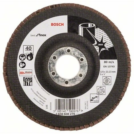 Fächerschleifscheibe X581. Best for Inox. Gerade Ausführung – EN 13743 für Winkelschleifer. Scheibendurchmesser: 125 mm, Bohrungsdurchmesser: 22,23 mm, Körnung 40. Optimale Drehzahl 5.000 – 7.500 min-1. Besonders geeignet zur Bearbeitung von Edelstahl (Inox). Leistungsstark dank Hochleistungszirkonkorund. Vollkunstharzgebunden. Stabiles X-Gewebe und hochaktiver Wirkstoffbeschichtung. Sehr hohe Abtragsleistung bei sehr hoher Standzeit. Gerade Ausführung – für Flächenschliff und Schweißnahtbearbeitung mit Anstellwinkel 5-15 Grad. Fächerschleifscheibe auf Trägerteller aus Glasgewebe.