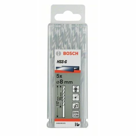 Metallbohrer HSS-G. DIN 338. Bohrerspitze 135 Grad. Durchmesser: 10.7 mm. Arbeitslänge: 94 mm. Gesamtlänge: 142 mm. Inhalt der Verkaufsverpackung: 5 Stück. Spiralbohrer aus Hochleistungsschnellstahl nach DIN 338. Rechtsschneidender Spiralbohrer Typ N. Bohrspitze 135°. Kreuzschliff nach DIN 1412 C. Durchmessertoleranz h 8. Einsteckende entspricht Bohrdurchmesser. Bohrerfarbe: Blank. Zweischneider. zylindrisch. zweispiralig. Geeignet für legierten und unlegierten Stahl bis zu einer Zugfestigkeit von 900 N/mm². Stahlguss. Grauguss. Sintereisen. Temperguss. Nichteisenmetalle. Hartkunststoffe. Präzisionsgeschliffener HSS-G-Stahlbohrer ermöglicht bis zu 40 Prozent schnelleren Bohrfortschritt bzw. bis zu 50 Prozent geringere Vorschubkraft als standardgeschliffene HSS-Bohrer mit Kegelmantelanschliff. Selbstzentrierende Kreuzschliffbohrspitze macht das Vorkörnen oder Vorbohren bis 10 mm Durchmesser überflüssig. Für den professionellen Einsatz. Hinweis: Verwenden Sie bei der Arbeit mit HSS-G Metallbohrern das Universalschneidöl 2 607 001 409.