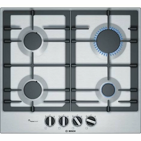 BOSCH -Edelstahl-Gaskochfeld zum Einbau – Kochstelle 60 cm breitautark – kann ohne Herd betrieben werdenhochwertiges Gaskochfeld von Bosch mit Einhandzündung und abnehmbaren Topfträgern – für eine einfache und gute ReinigungBesondere Merkmale