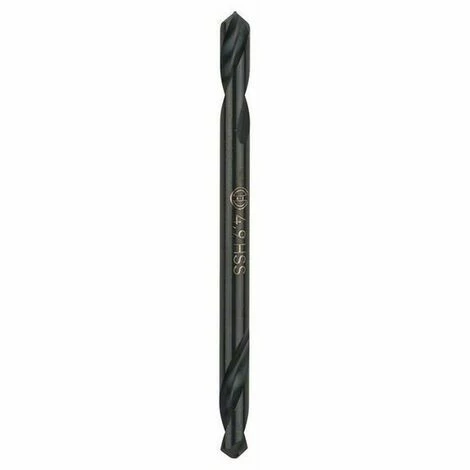 Doppelendbohrer HSS-G, Durchmesser: 4,9 mm, Arbeitslänge: 17 mm, Gesamtlänge: 62 mm, Inhalt der Verkaufsverpackung: 10 Stück, geschliffener HSS-Bohrer, ähnlich DIN 1897, rechtsschneidender Spiralbohrer Typ N, Bohrspitze 118 Grad, Kreuzschliff nach DIN 1412 C, Durchmessertoleranz h 8, zweispiralig, geeignet für viele handwerkliche und industrielle Anwendungen wie Stahl- und Buntmetallblechen sowie Kunststoffen, für Einsatz in Handbohrmaschinen (auch Akkubetrieb) und Bohrautomaten, speziell im Karosseriebau und in der Metallbearbeitung (z. B. Nietloch- oder Gewindebohrungen), mit doppelter Standzeit durch zwei Bohrspitzen und Spiralen, Kreuzschliffbohrspitze zum Bohren ohne Vorkörnung