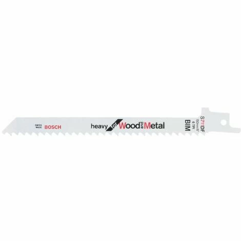 Säbelsägeblatt S 711 DF. Heavy for Wood and Metal. Werkstoff: BIM. Zahnausführung: geschränkt. gefräst. Einsatzbereiche: Für Holz mit Nägeln/Metall. Spanplatten (kleiner als 100 mm Stärke). für GFK/Epoxy (kleiner als 50 mm Stärke). Speziell für Kurvenschnitt. Inhalt der Verkaufsverpackung: 5 Stück.
