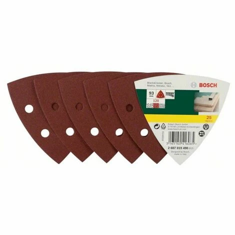 Schleifblatt-Set für Deltaschleifer. 25-teilig. 6 Löcher. Mit Klettsystem. Blattabmessung (Eckmaß): 93 mm. Körnung 120. Hochwertige Universalschleifblätter für detailgenaues Schleifen in Ecken und an Kanten. Leistungsstarke Schleifblätter für detailgenaues Schleifen mit Dreieckschleifern auf kleinen Flächen wie Ecken. Profilen und auf Kanten. Ideal für das Vorbereiten von Oberflächen (120er Körnung – fein). Zum perfekten Vorbereiten von Oberflächen für die Weiterverarbeitung. zum Planschleifen und Vorschleifen von kleinen Unebenheiten auf Hart- und Weichholz. Holzwerkstoffen. Spanplatten und Metall. Ausbessern vor dem Farb- oder Lackauftrag. Universal-Schleifblätter mit Klettsystem für sicheren Halt und schnellen Blattwechsel. 6 Absauglöcher für Staubabsaugung. Passend zu Dreieckschleifern aller Elektrowerkzeugmarken. Geeignet für folgende Werkstoffe: Farbe. Füller. Lack. Holz/Holzwerkstoffe. Hart-/Weichholz. Spanplatten. Metall und Rost. Sicherheitshinweis: Bei Gebrauch bitte Schutzbrille. Staubschutzmaske und Gehörschutz tragen.