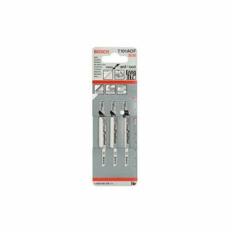 Bosch Stichsägeblatt T 101 AOF Clean for Hard Wood, 3er-Pack | Eigenschaften: Werkstoff: Bimetall, Gesamtlänge: 83, Typ: T 101 AOF, Aufnahme: T-Schaft, Spezifikation: Clean for Hard Wood, Zahnausführung: geschliffen, Einsatzbereiche: Hartholz, Laminate (1,5-15 mm), beschichtete Platten/HPL, Sperrholz, speziell für Kurvenschnitt, kein Ausriss, Freiwinkel: nein, Geschränkt: nein, Gewellt: nein, Progressiv: nein, Raspel: nein, Räumstellung: nein, Riff: nein, Wellengeschliffen: nein, Zähnegefräst: Nein, Zähnegeschliffen: Nein, beschichtete Platten [mm]: 1,5-15, Hartholz, Platten [mm]: 1,5-15, Laminate [mm]: 1,5-15, Materialanwendung: , Geeignet für Kunststoff: Nein, Geeignet für Holz: Ja, Geeignet für Stahl: Nein, Geeignet für Edelstahl: Nein, Geeignet für Nichteisen-Metalle: Nein