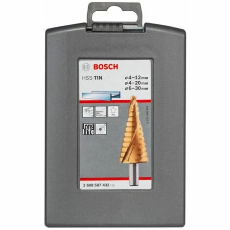 Bosch Stufenbohrer HSS-TiN-Set. 3-teilig. 4 – 12 mm. 4 – | Hersteller-Nr.: 2608587432 | EAN: 3165140630269 | •3tlg. Stufenbohrer HSS-TiN-Set