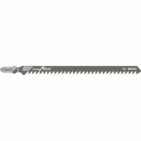 Stichsägeblatt für Holz Eigenschaft: Typ:T 344 D |Gesamtlänge:152 mm|Zahnteilung:4 mm|Blattmaterial:HCS |Schnitt:gerade, schnell |Weichholz:5–100 mm|Span-, Tischler-, Holzfaserplatten:5–100 mm|Laminat:– mm|Inhalt:5 Stück|Marke:Bosch |WGNr.:W247 |